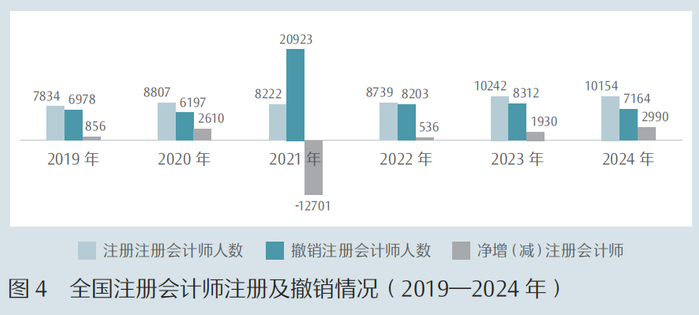 1.按注册会计师数量统计。截至2024年12月31日,全国共有注册会计师105007人,比上年度末净增加2990人,其中,注册10154人,撤(注)销注册7164人。