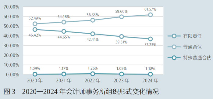 为便于比较,在对比历年组织形式时,将个人会计师事务所并入普通合伙会计师事务所进行统计。最近五年,有限责任会计师事务所占所有会计师事务所的比例逐年下降,普通合伙会计师事务所的比例逐年上升,特殊普通合伙会计师事务所占比基本稳定,变化不大(详见图3)。