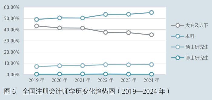 从历年情况来看,本科及以上的注册会计师占比呈上升趋势,大专及以下的注册会计师占比呈下降趋势(详见图6)。