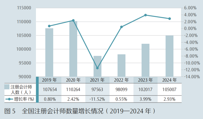 全国注册会计师人数自2021年负增长后,2022—2024年净增量直线攀升,2024年已超2020年水平(详见图4)。从2022年开始,注册会计师总人数一直在稳步提升(详见图5)。