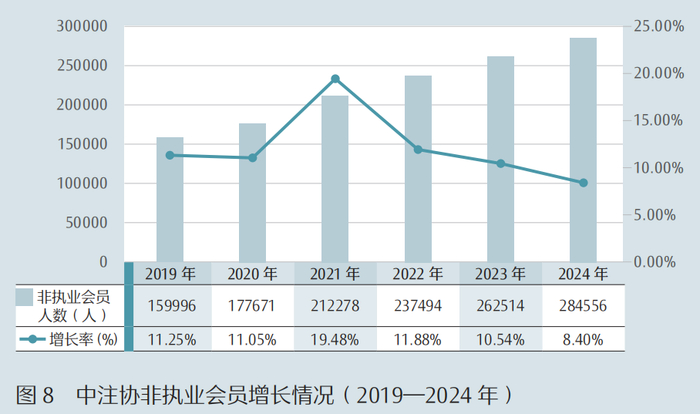 2019—2024年,中注协非执业会员数量逐年稳步增长,2021年度增长率最高(19.48%),2024年增长率下降至8.40%(详见图8)。主要原因是2021年财政部首次开展整治注册会计师挂名执业行为专项工作,当年撤销(注销)注册会计师人数达到20923人,其中转为非执业会员人数达16554人。2024年度增长率下降,取消多年不参加年检的非执业会员资格是主要原因。