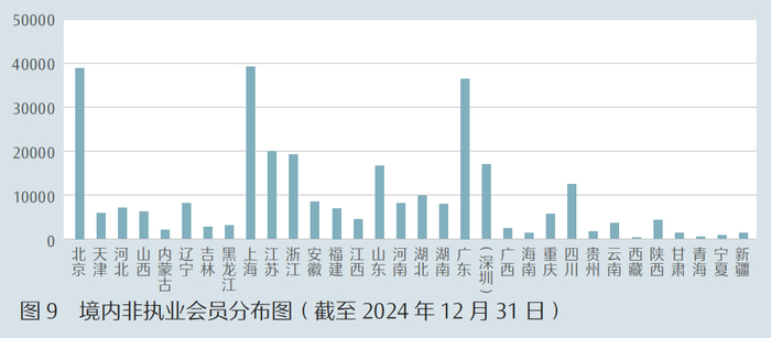 境内非执业会员分布情况。截至2024年12月31日,中注协境内非执业会员283802人。其中,上海市非执业会员数量最多,共有39056人,占境内总数的13.76%;其次是北京市,共有38920人,占13.71%(详见图9,数据见表3)。