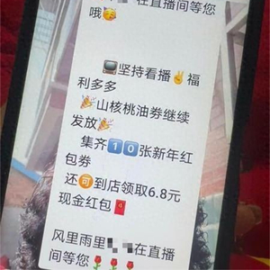 “兑换券通常在直播开始、中间、结尾3个时段发放,要领到券得全看完。”刘鹏出示的群聊截图显示,这个名为“富民路店长服务(2群)”的群有105名成员,群聊十分活跃。管理员不时发布“坚持看播,福利多多”“山核桃油券继续发放”“还可到店领取6.8元现金红包”等信息。开播前,管理员会发红包,标注开播时间。
