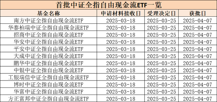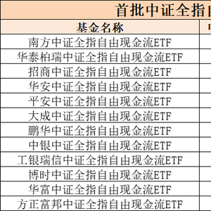 4月7日,首批跟踪中证全指自由现金流的ETF正式获批,花落华泰柏瑞、南方基金、博时基金、招商基金、鹏华基金、平安基金、工银瑞信、大成基金、华安基金、中银基金、华富基金、方正富邦等12家基金公司。