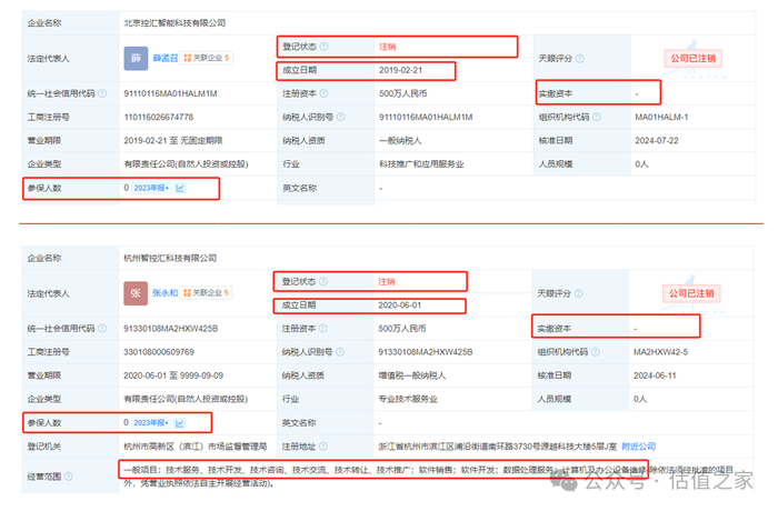 另一大异常关联方为杭州智控汇科技有限公司,其同样为发行人参股公司。杭州智控成立于2020年,而在其成立后的次年发行人向其的销售收入便高达669.48万元;2021年,公司向其销售金额则为405.74万元,仍维持在数百万级规模水平。同时,令估值之家感到颇为不解的是,根据招股说明书显示,发行人与杭州智控的关联交易内容为销售商品;但我们反观其经营范围却为各类技术、软件、维修服务,而这与发行人所销售的工控机、工控板卡产品的主营业务可谓是毫不相干。同时,杭州智控的实缴资本与参保人数同样均为0,也极为巧合地同样选择了于2024年进行注销。