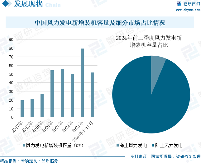 近几年,随着国家政策对可再生能源发展的大力扶持,风电场数量持续增长,风力发电新增装机容量也呈现平稳增长的态势。国家统计局数据显示,2024年1-11月,中国风力发电新增装机容量为51.75GW,较2023年同期增加10.36GW。风力发电主要分为陆上风电和海上风电两大方向。我国地大物博的优势,为陆上风力发电的发展提供更大空间,我国将风电场主要建设在新疆、内蒙等地广人稀的地区,避开居民聚集区,我国良好的地理条件为我国陆上风力发电市场创造了良好的发电条件。而海上风电因其风速稳定、资源丰富的优势,逐渐成为未来风力发电发展的重要方向。数据显示,2024年前三季度,中国海上风力发电新增装机容量为2.47GW,占比6.31%;陆上风力发电新增装机容量为36.65GW,占比93.69%。