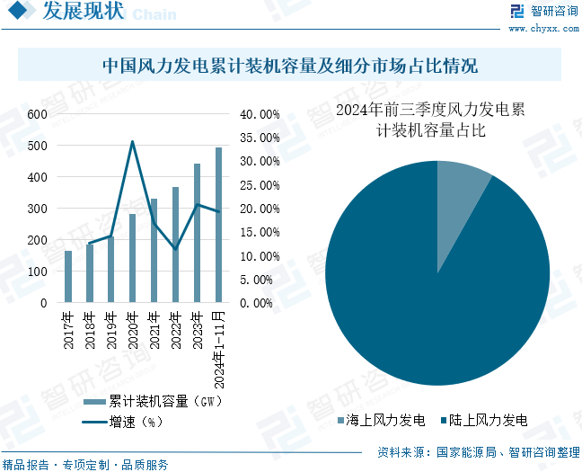 我国风力资源丰富,有较好的发展风力发电的资源优势。目前我国已经成为全球风力发电装机容量最大、增长最快的市场。近年来,随着风电场的建设成本和投资规模的扩大,我国风力发电累计装机容量整体呈现快速增长的趋势。国家能源局数据显示,2024年1-11月,中国风力发电累计装机容量同比增长19.2%至492.18GW。从细分市场来看,2024年前三季度,中国海上风力发电累计装机容量为39.1GW,占比8.15%;陆上风力发电累计装机容量为440.45GW,占比91.85%。截至2024年三季度,我国海上风电累计装机已连续三年稳居全球第一位,超过第2—5名国家海上风电并网总和。随着海上风电大型化进程不断推进和各家主机厂纷纷推出低价主机产品,多个海上风电项目已经成功实现平价。未来,海上风力发电的累计装机容量预计将持续稳步上扬,成为推动我国风电场装机容量保持迅猛增长的关键力量。