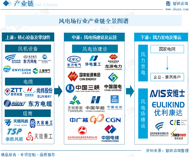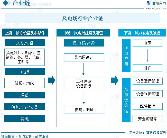 风电场产业链上游为风机设备、电缆、塔筒、测风防雷设备等核心设备及零部件,其中,风机设备包括风电叶片、轴承、齿轮箱、变流器、轮毂、主轴等;电缆包括陆缆和海缆。产业链中游为风电场的建设和运营。产业链下游为风力发电及风电场维运市场,其中,风电场维运包括设备运行管理、设备维护管理、配件管理、安全管理等。