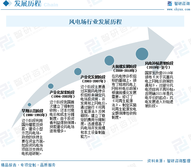1986年,我国第一座风电场-马兰风力发电场(四台V15-55/11kW风机)在山东荣成并网发电,是我国风电历史上的里程碑,标志着中国风力发电的开端。总体来看,中国风电场行业发展经历了早期示范、产业化探索、产业化发展、大规模发展、补贴退坡等五个阶段。