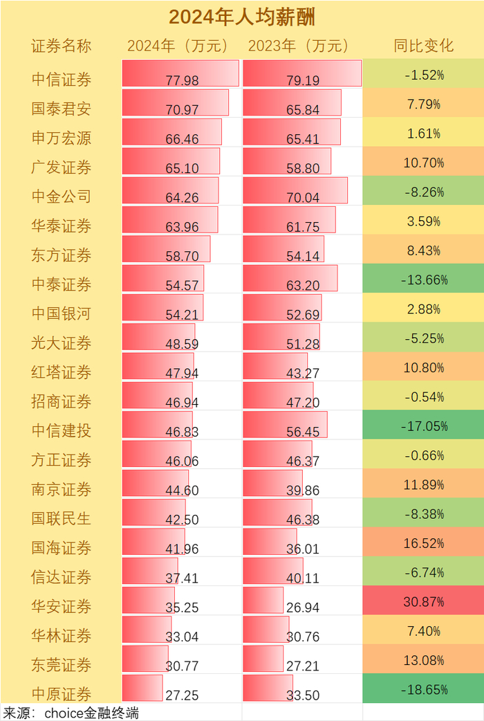在员工平均薪酬方面,Choice金融终端显示,中信证券、国泰君安位居前两名,分别为77.98万元、70.97万元。其中,国泰君安涨薪近5万元。