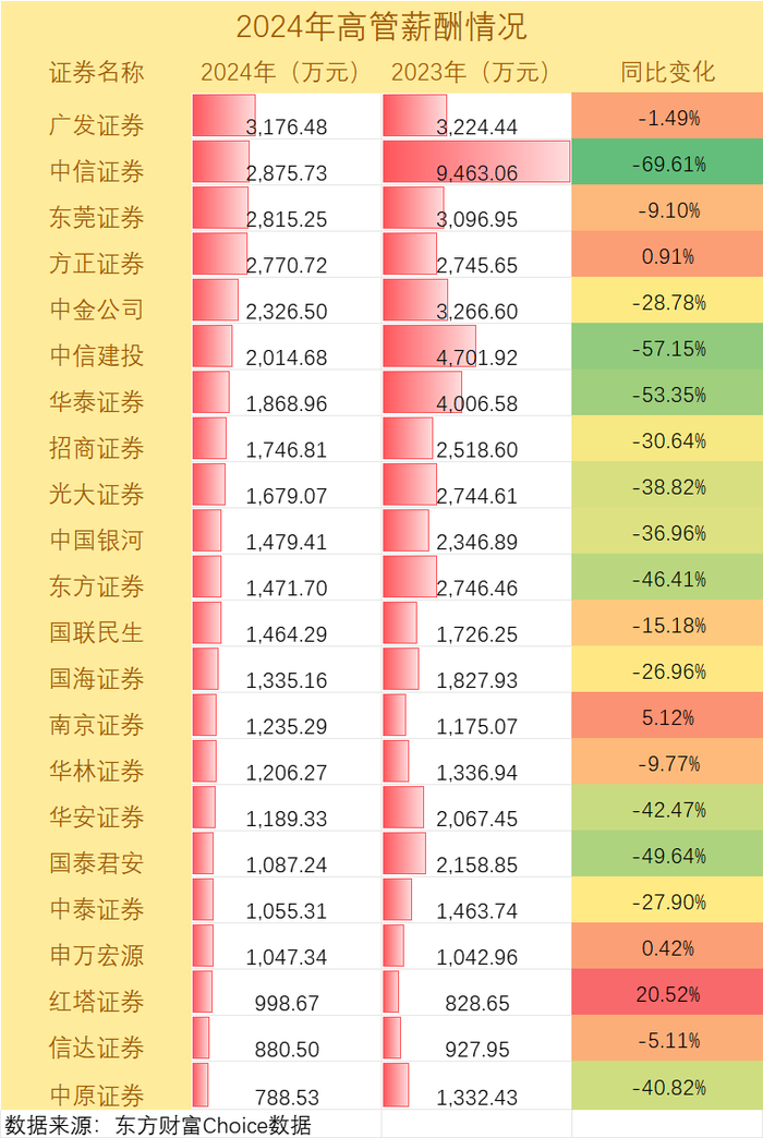 截至目前,广发证券(000776.SZ)取代中信证券位于高管总薪酬榜单首位,为3,176.48万元。中信证券(2,875.73万元)、东莞证券(2,815.25万元)、方正证券(2,770.72万元)、中金公司(601995.SH)(2,326.50万元)、中信建投(2,014.68万元)均超过2000万元。
