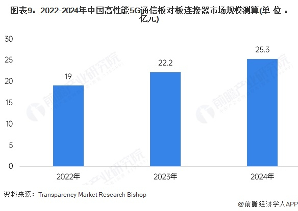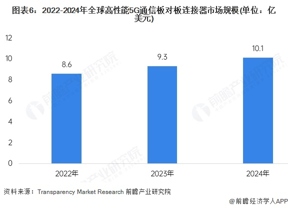 前瞻结合Transparency Market Research提供的板对板连接器市场规模,以及Bishop & Associates中板对板连接器中通信领域的占比进行测算,全球通信板对板连接器市场规模从2022年的32.4亿美元上升至2024年的35.6亿美元。结合高性能5G通信的40%的比重,目前全球高性能5G通信板对板连接器的市场规模从2022年的13亿美元上升至2024年的14.3亿美元,三年年复合增速为7%。