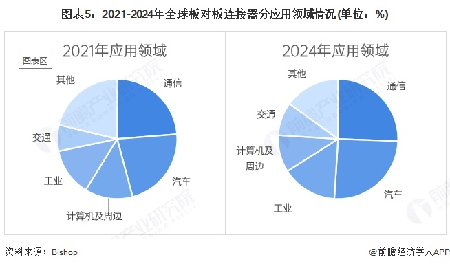 从板对板连接器的下游细分领域来看,通信是主要应用领域;根据Bishop & Associates的数据显示,2021年全球连接器中通信领域的比重为23.5%,2024年为25.6%。对比2021年和2024年下游领域来看,汽车领域占比提升最多,主要是受到新能源汽车智能化和电气化的需求影响,板对板连接器在该领域的出货量较大。其他对板对板有需求的还有工业、计算机、交通等。