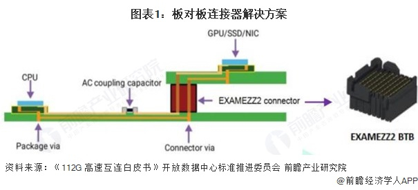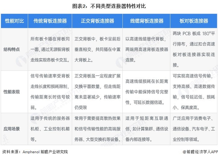 目前市面上有多种不同类型的连接器,目前有传统背板连接器、正交背板连接器、线缆背板连接器以及板对板连接器。传统背板连接器所有卡板插在同一面,信号传输率受背板长度限制,适用于传统的服务器机柜。性能较好的有正交背板和线缆背板,后者的传输速率更快,信号完整性更好,但是适用于短距离的互联通信。而板对板连接器在通信技术上有较好的性能表现,从结构上看板对板连接器是平行排布,性能可实现高速信号传输,延迟低,损耗小,广泛应用于消费电子、通信设备、汽车电子、工业控制等领域。