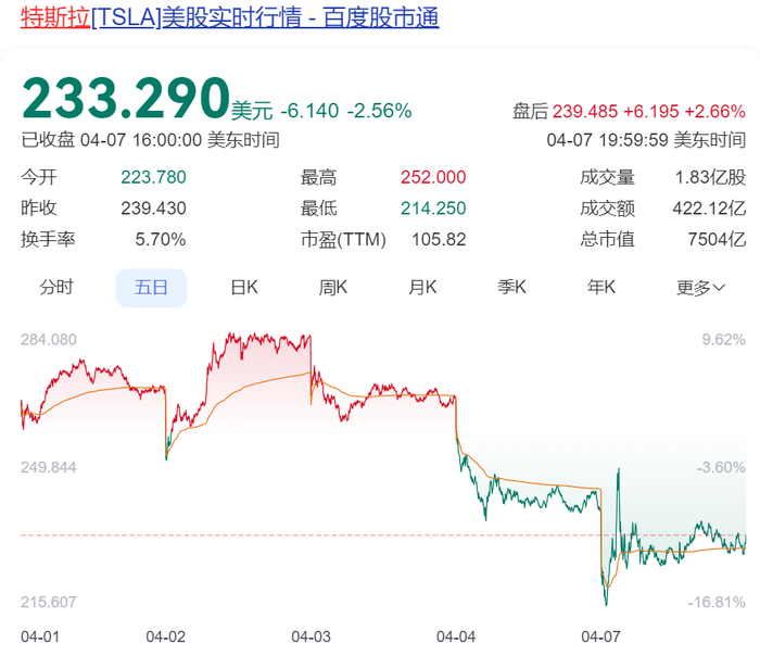 当地时间4月8日,特斯拉股价一度跌近10%,截至收盘跌幅收窄至2.56%,总市值7504亿美元。