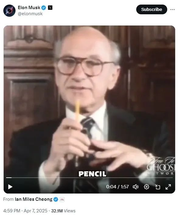 与此同时,4月7日,马斯克在其社交媒体账号上分享了一段已故经济学家米尔顿·弗里德曼的视频,视频中弗里德曼通过分析制造一支简单木制铅笔的材料来源,解释了国际贸易合作的好处。