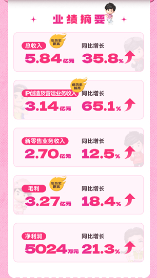 2025年3月31日,巨星传奇(6683.HK)公布其2024年度业绩报告。报告显示,公司IP创造及营运业务的收入约为3.14亿元,同比增长65.1%;新零售业务的收入约为2.7亿元,同比增长12.5%,两大业务板块共同助推公司整体营收显著增长。整体来看,公司收入由2023年的4.30亿元增至2024年的5.84亿元,同比增长35.8%,依旧维持高增长态势。