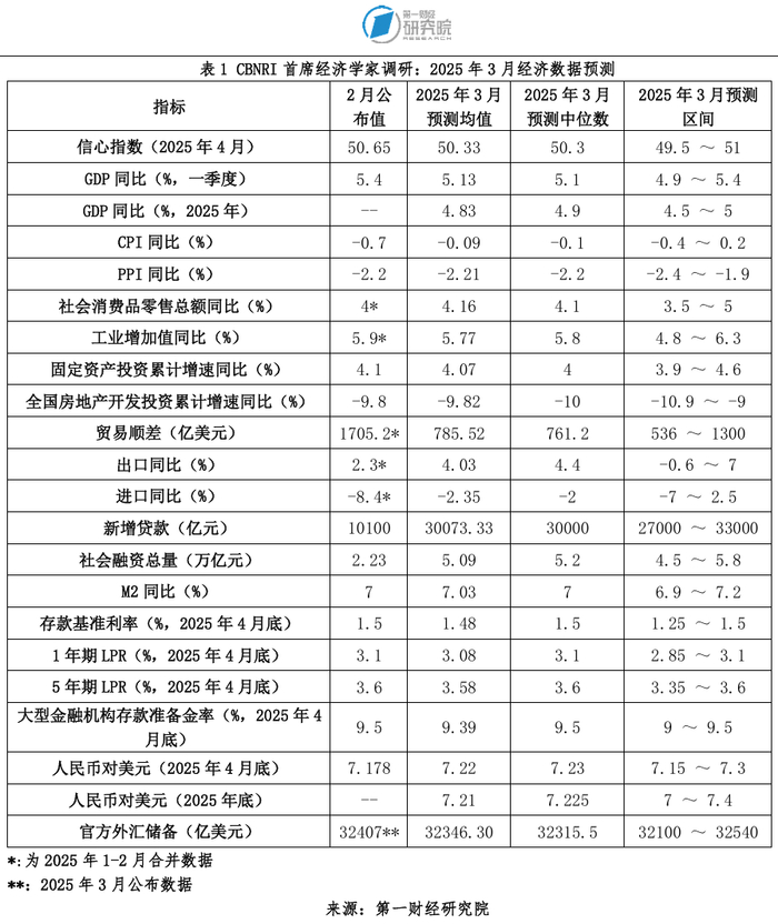2025年4月,第一财经研究院发布的“第一财经首席经济学家信心指数”为50.33,维持50荣枯线以上。经济学家们认为今年第一季度我国经济延续回升向好的态势,一季度GDP同比增速将高于去年第四季度5%的公布值,预测均值为5.13%。他们对2025年度GDP同比增速的预测均值为4.83%,中位数为4.9%。
