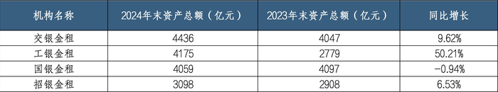 截至2024年末,交银金租以4436亿元总资产规模排在金租行业首位;工银金租以4175亿元紧随其后;国银金租则以4059亿元位列第三。这标志着交银金租在经过多年角逐后,再次坐上行业头把交椅。