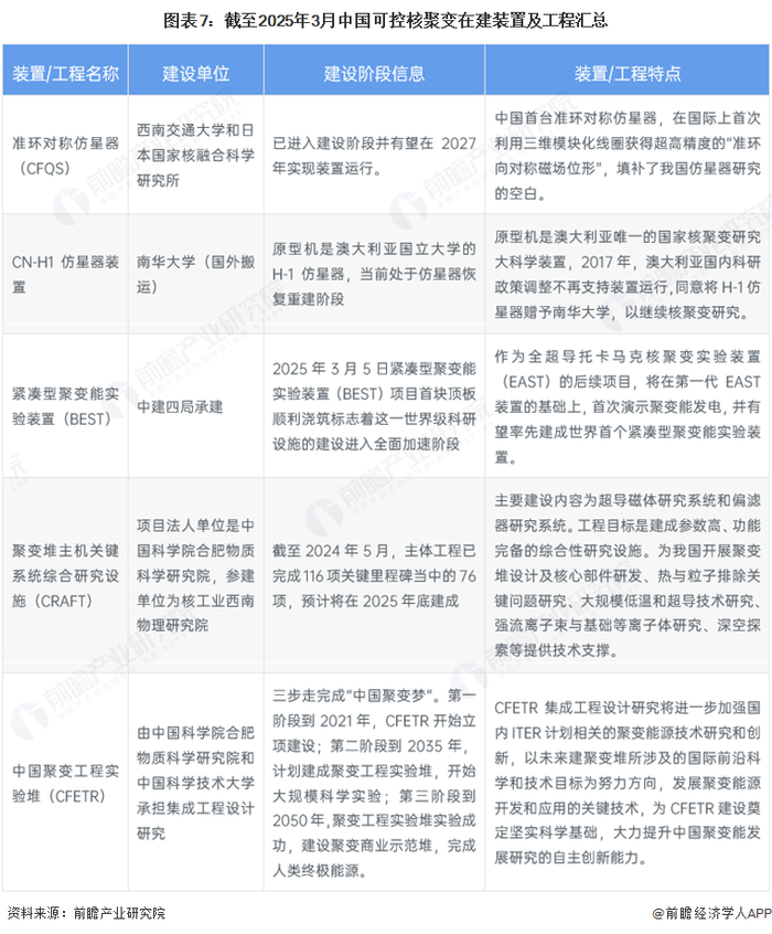 基于公开信息,截至2025年3月,国内尚在研制的可控核聚变装置设计、尚在建设的反应堆工程如下所示: