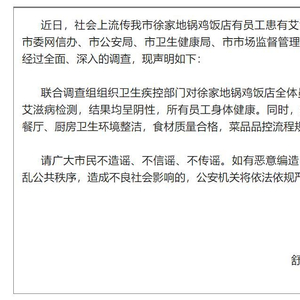 联合调查组组织卫生疾控部门对徐家地锅鸡饭店全体员工(14名)进行了艾滋病检测,结果均呈阴性,所有员工身体健康。同时,经实地检查,饭店内餐厅、厨房卫生环境整洁,食材质量合格,菜品品控流程规范严谨。请广大市民不造谣、不信谣、不传谣。如有恶意编造、散布谣言,故意扰乱公共秩序,造成不良社会影响的,公安机关将依法依规严肃处理。