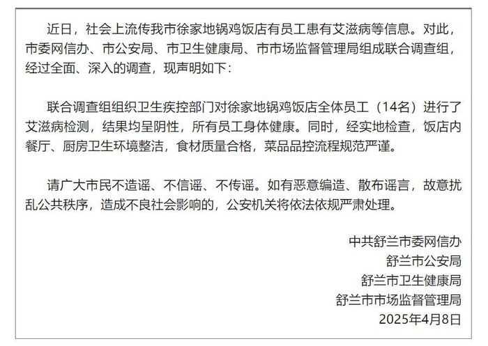 4月8日,中共舒兰市委网信办、舒兰市公安局、舒兰市卫生健康局、舒兰市市场监督管理局联合通报称,联合调查组组织卫生疾控部门对徐家地锅鸡饭店全体员工(14名)进行了艾滋病检测,结果均呈阴性,所有员工身体健康。
