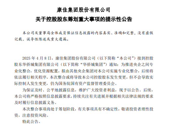 深康佳A(000016)于4月8日晚公告,公司接到控股股东华侨城集团通知,为推进央企之间专业化整合,优化资源配置,拟由其他央企集团对公司实施专业化整合,后续将依法履行相关程序。