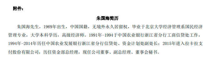 在加入拉卡拉之前,朱国海曾长期在农行浙江分行、农发行浙江省分行工作。自2015年加入拉卡拉以来,先后担任资金部总经理、副总经理以及董事会秘书等重要职务。