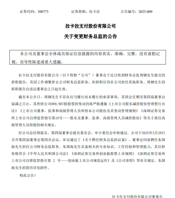 近日,拉卡拉支付股份有限公司发布重要人事变更公告,周钢因工作调整辞去财务总监职务,辞职后仍在公司担任其他职务。