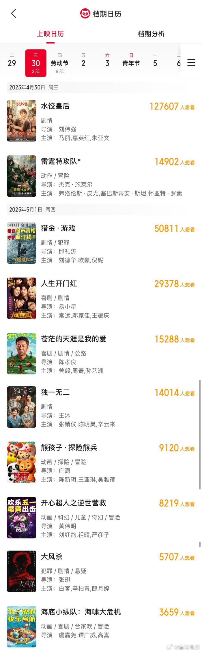 10部影片定档五一档 界面新闻 界面新闻官方账号 2025.04.0910:11 关注 4月9日消息,电影《人生开门红》官宣定档5月1日上映,据猫眼专业版上映日历显示,截至当前共10部电影定档2025五一档上映。
