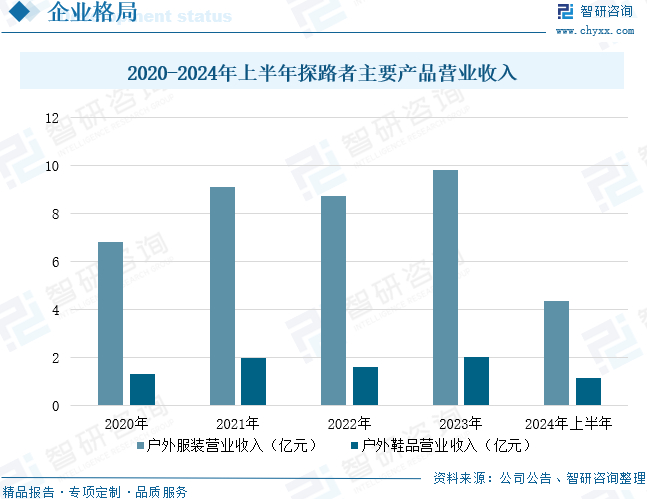 探路者控股集团股份有限公司专业从事探路者TOREAD、TOREAD KIDS、TOREAD.X户外用品的研发设计、运营管理及销售,通过品牌建设推广、产品研发设计、全渠道营销网络、供应链整合与管理,为广大消费者提供性能可靠、外观时尚的全品类户外用品,产品已覆盖目前国内户外生活的主要领域,包括户外服装、鞋、背包、帐篷、睡袋、登山装备等品种。数据显示,2024年上半年,探路者户外服装营业收入同比增长8.5%至4.34亿元;户外鞋品营业收入同比增长14.29%至1.12亿元。