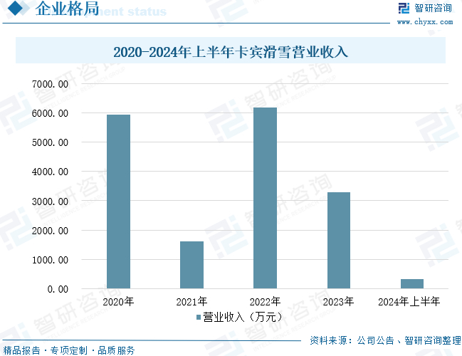 北京卡宾滑雪体育发展集团股份有限公司成立于2010年,是国内从事滑雪产业综合化服务的企业。公司率先提出了滑雪场“一站式服务”解决方案的构想,并成功使之落地。经过多年发展,公司从滑雪场规划设计、滑雪道施工设计、设备器材销售、经营管理等滑雪场一站式服务出发,已经完成了以滑雪场服务为基础,衍伸至冰雪设备、器材生产制造、冰雪旅游四季运营及投资管理、冰雪教育培训、冰雪产业及大数据研究、冰雪文化投资等领域的初步战略发展布局。卡宾滑雪作为国内滑雪设备、装备以及器材的生产制造以及多家国际知名滑雪品牌的中国区代理,其业务覆盖从滑雪场前期设计规划到后期管理运营的各环节。数据显示,2024年上半年,卡宾滑雪营业收入为321.11万元。
