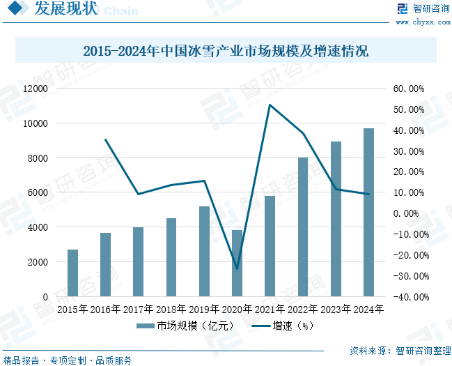 冰雪产业是在冰雪资源开发的基础上形成的特殊资源型产业,具有覆盖范围广、产业链条庞大的特点。北京冬奥会的成功举办成为我国冰雪产业发展的强力助推器,激发了消费者参与冰雪运动的热情。近年来,我国政府投入大量资金支持冰雪队伍建设、冰雪场馆建设、冰雪旅游开发等方面的发展,在“带动三亿人参与冰雪运动”战略目标的指引下,我国冰雪经济进入黄金发展期。数据显示,自2015年以来,中国冰雪产业规模实现了显著增长,冰雪产业规模从2015年的2700亿元增长至2023年的8900亿元,2024年冰雪产业规模达到9700亿元。未来,随着“冰雪+”商业模式逐渐多元化,中国冰雪产业将迎来更大的增长空间。