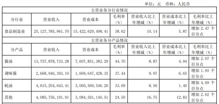 目前,海天味业绝大部分收入来源于食品制造业,2024年全年实现营业收入251.28亿元,同比增长10.14%,毛利率也较上年同期增加了2.47个百分点至38.62%,该公司表示这主要是由于材料采购成本下降、精益及科技驱动成本控制等。