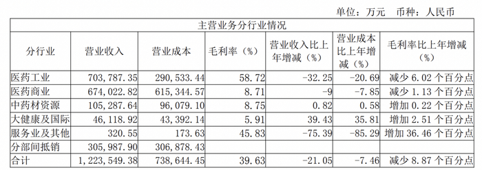 分行业来看,其中,太极集团2024年医药工业实现销售收入70.38亿元,同比下降32.25%;医药商业实现销售收入67.40亿元,同比下降9.00%;中药材资源板块实现销售收入10.53亿元,同比增长0.82%;大健康及国际业务实现销售收入4.61亿元,同比增长39.43%。