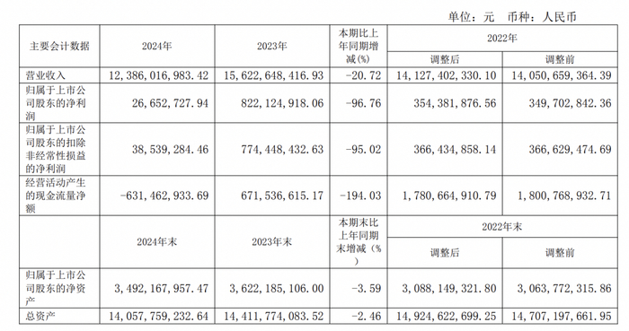 2024年,太极集团实现营业收入123.86亿元,同比下降20.72%;归属于上市公司股东的净利润0.27亿元,同比下降96.76%;归属于上市公司股东的扣除非经常性损益的净利润0.39亿元,同比下降95.02%;经营活动产生的现金流量净额为-6.31亿元,同比下降194.03%。