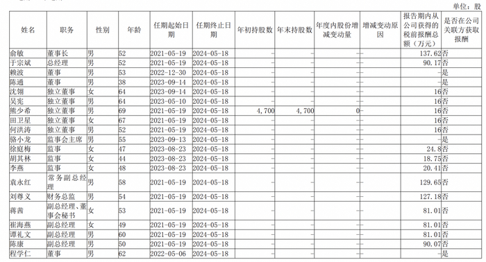 薪酬方面,2024年,俞敏薪酬为137.62万元,于宗斌薪酬为90.17万元。
