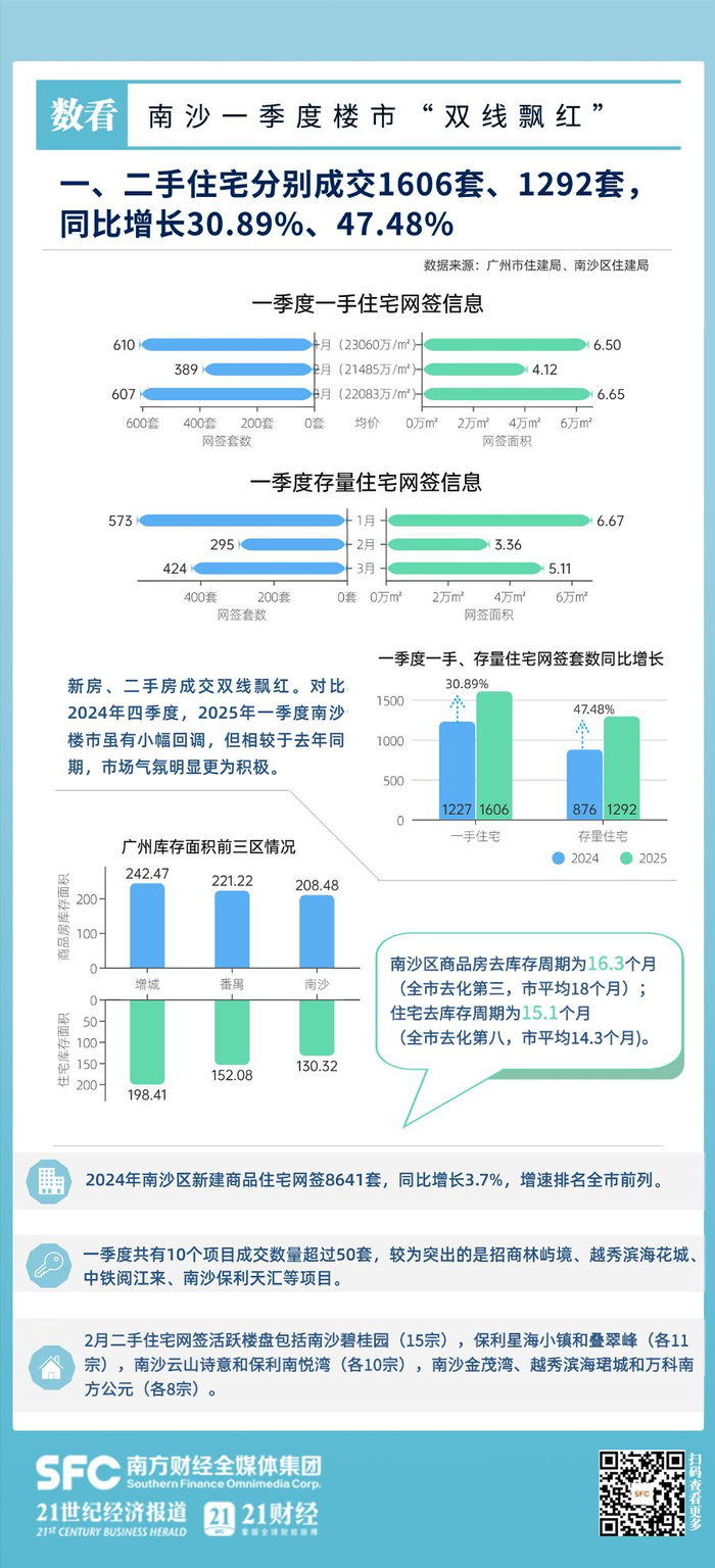 南方财经全媒体记者分别从南沙区住建局及广州市住建局获悉,2025年1—3月南沙新建商品住宅网签1606套,同比增长30.89%,存量房网签1292套,同比增长47.48%。