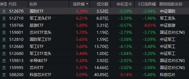 受行情提振,场内以国防、军工龙头、芯片、科创芯片为代表的主题型ETF,今天也迎来大涨。此前一段时间,科技主题的ETF连续回调,年内涨幅被抹平。