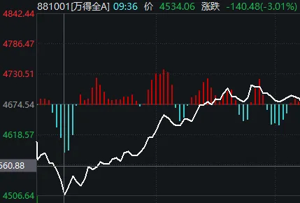 9:36左右,万得全A指数创出周一以来的新低,但随后立刻振荡回升。