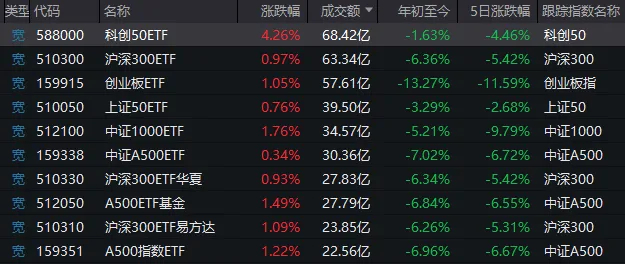从场内成交额居前的单只宽基ETF来看,科创50ETF(588000)和创业板ETF(159915)较昨日仍有放量;而昨日爆量的沪深300ETF、中证1000ETF等产品,今天则纷纷缩量。
