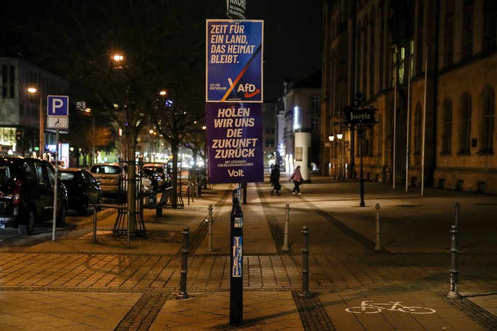 当地时间2025年2月6日,德国马德堡,一张极右翼反移民政党德国替代党(AfD)的选举海报在街头展示,上面的标语为“是时候还我们一个家园”。 图源:视觉中国