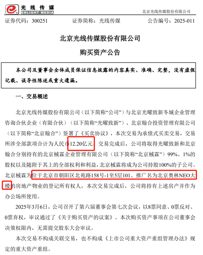 刚刚过去的3月份,光线传媒还官宣,将以12.2亿元承债式交易,取得北京棫霖企业管理有限公司100%股权,间接获得北京奥林NEO大楼所有权。奥林NEO大楼总建面2.85万平米,未来将作为光线传媒办公楼使用。光线传媒表示,买楼将提升公司形象,而且这个楼未来增值潜力也不错。