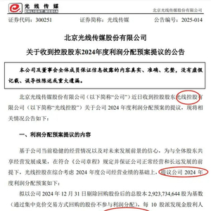 4月8日,《哪吒2》出品方光线传媒发布《关于收到控股股东2024年度利润分配预案提议的公告》,控股股东光线控股提议,2024年拟每10股派发现金红利2元(含税),共计派发5.85亿元。但是不送红股,不公积金转增股本了。