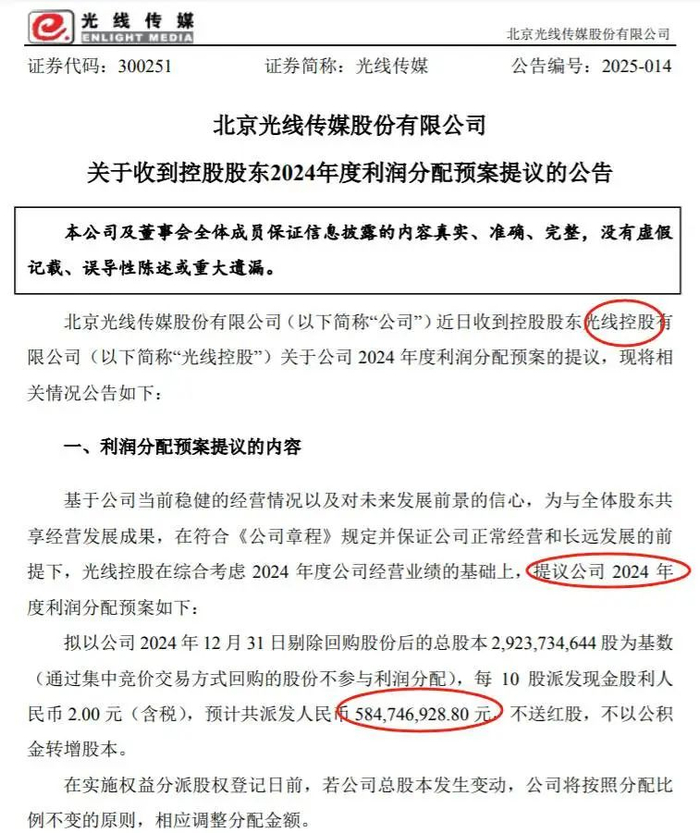 年报都还没发,光线传媒大股东就提议分钱了,还想分5.84亿!
