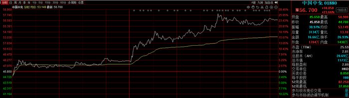 A股市值超千亿的行业龙头中国中免强势涨停,截至收盘,涨停封单超5万手,股价报收66.87元/股,市值为1383亿元。中国中免港股涨幅更大,截至收盘大涨近24%。此外,王府井、海汽集团、中百集团、格力地产、欧亚集团等免税概念股也纷纷涨停,
