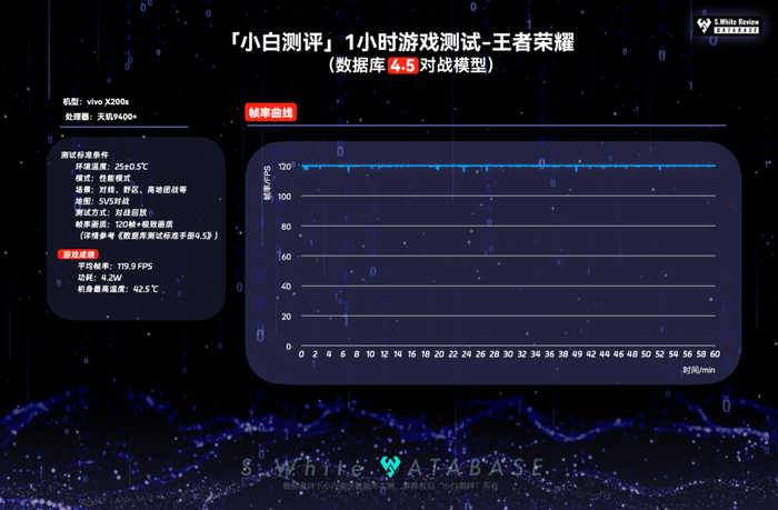 游戏表现上,vivo X200s长时间游戏场景《王者荣耀》一小时:平均帧率119.9FPS(满帧120),功耗4.2W,机身最高温度42.5℃。