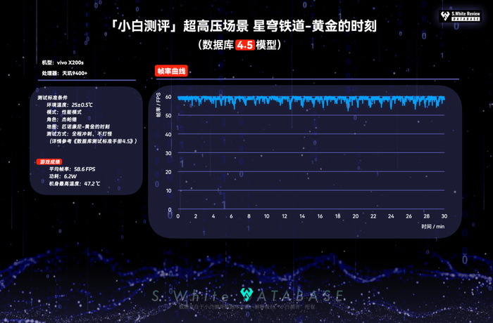 超高压场景《星穹铁道》30分钟:平均帧率58.6FPS(满帧60),功耗6.2W,机身最高47.2℃。