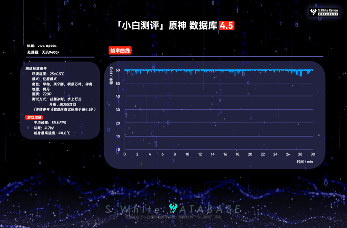 多场景测试《原神》30分钟:vivo X200s平均帧率59.8FPS(满帧60),功耗4.7W,机身最高44.6℃。