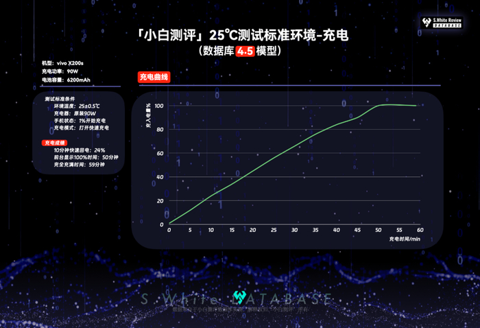充电表现上,vivo X200s配备6200mAh电池+90W有线充电功率,25℃环境中从1%开始测试,10分钟快速回电24%,50分钟前台充入100%,59分钟完全充满。